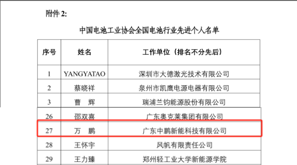 活動(dòng)現(xiàn)場(chǎng),中國(guó)電池工業(yè)協(xié)會(huì)向獲獎(jiǎng)單位和個(gè)人進(jìn)行了頒獎(jiǎng)授牌。中鵬科技董事長(zhǎng)萬(wàn)鵬榮獲“全國(guó)電池行業(yè)先進(jìn)個(gè)人”榮譽(yù)稱號(hào)。